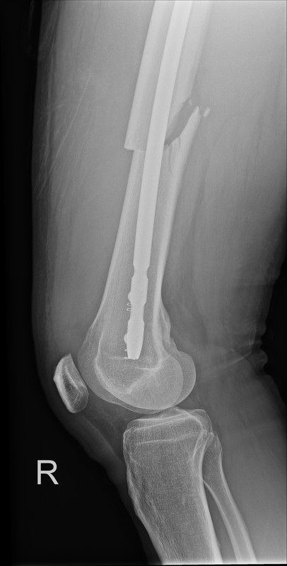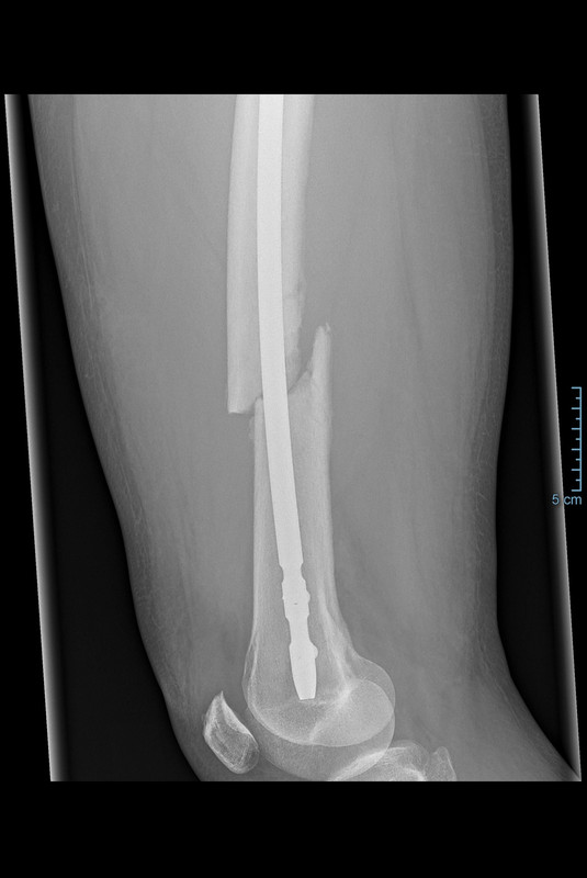 In einer "Not"-OP (KH Zams/Tirol) wurde ein Nagel mit 3 Schrauben eingebracht, um den Bruch zu stabilisieren.